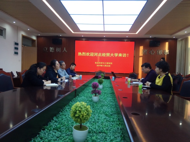2019年11月22日,beat365官方网站鞠国泉、刘增然和巨浩羽老师赴青岛农业大学食品科学与工程学院调研学习。beat365官网鞠国泉老师介绍了学院的基本情况,青岛农业大学食品科学与工程学院副院长孙庆杰讲解了本学院的发展历史,随后针对一流专业建设分享了宝贵的实践经验。