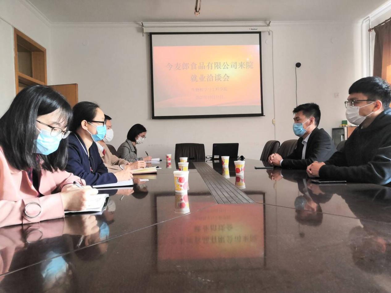 2020年10月15日上午,今麦郎面品有限公司在beat365官方网站会议室开展就业洽谈会,今麦郎康献辉经理一行二人、生工学院党委书记曹一伟及毕业班辅导员参加了此次会议。