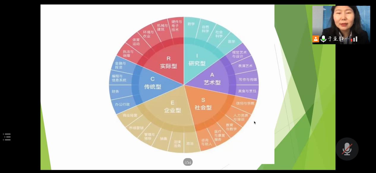 在讲座开始时,于亚静校友让同学们做了一个霍兰德职业兴趣测试,并讲解了六种职业类型,以此给同学们解释职业兴趣爱好的选择。在完成测试之后,于亚静校友以两位同学的测试结果为例,通过兴趣,能力与价值三方面为同学们讲解了如何找到最适合自己的完美工作。最后,于亚静校友为同学们进行答疑解惑。