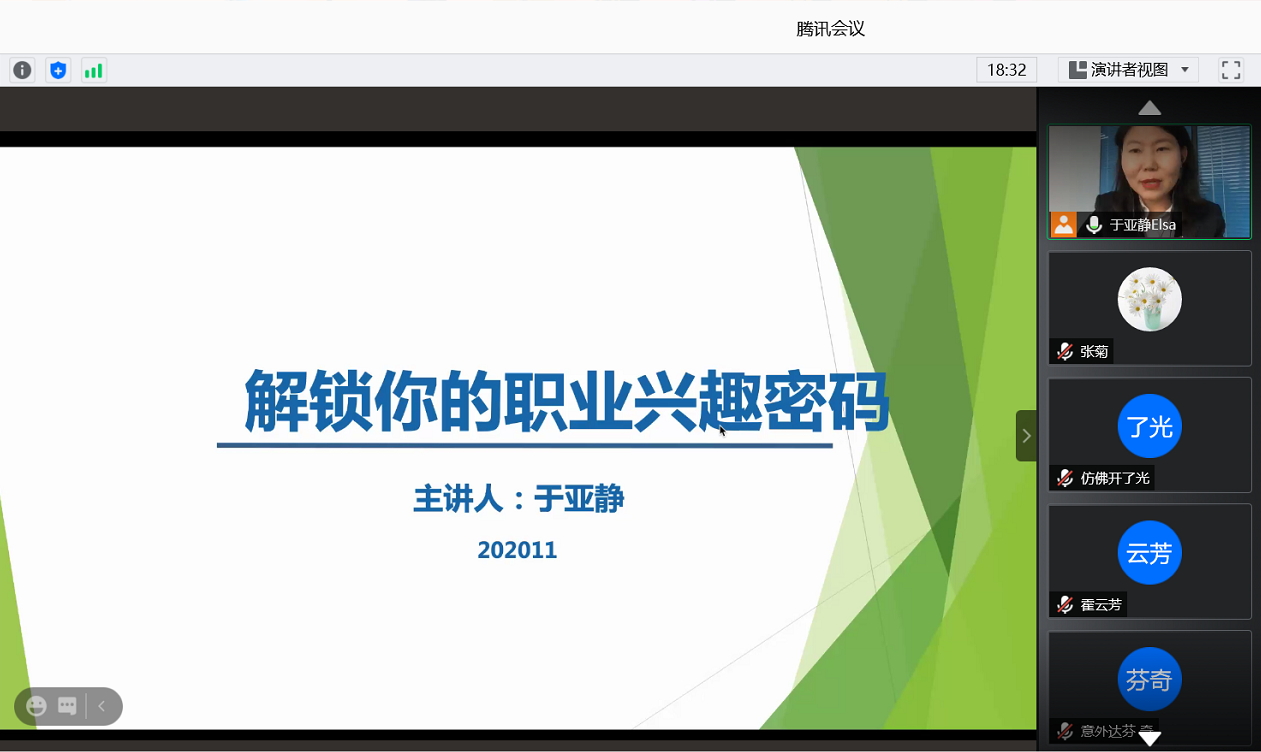 11月23日下午,beat365官方网站邀请2000级校友于亚静为生工学院学生作题为《解锁你的职业兴趣密码与大学生生涯规划》的职业规划讲座。本次讲座由张菊老师主持,通过腾讯会议开展,并在微信群里与同学们沟通交流互动。