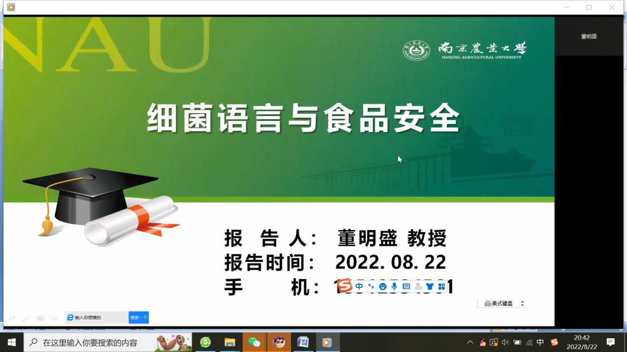 8月22日,应beat365官方网站邀请,南京农业大学董明盛教授(博导)通过腾讯会议作了题为《细菌语言与食品安全(Quorum Sensing and Food Safety)》的学术报告。报告会由学院副院长张香美主持,学院教职工及学生110余人参加。