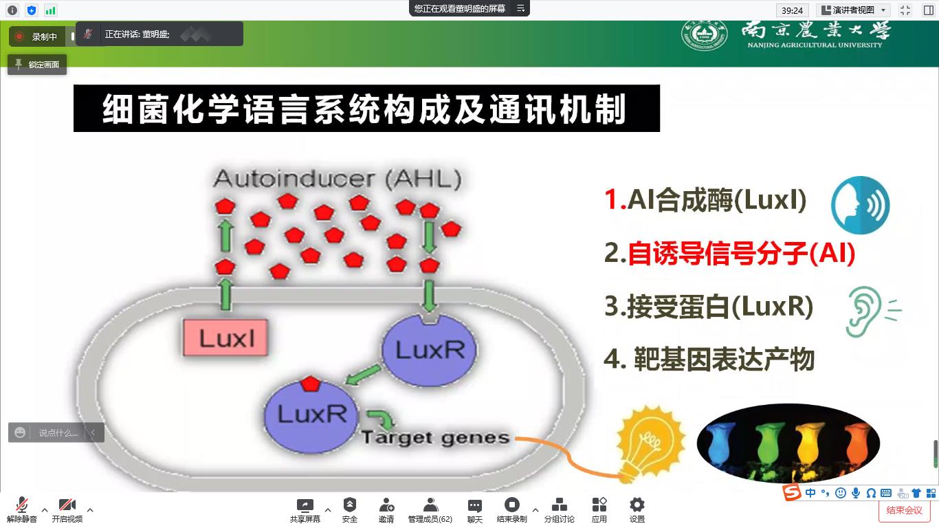 董明盛教授重点讲述了Q S现象及其与食品安全的关系,阐述了以食品有害菌的Q S现象为靶点的食品安全控制新策略。董明盛教授主要从细菌的分子语言、细菌的分子语言通讯交流系统、如何破译细菌的语言、群体感应对食品腐败的影响及其机制以及如何利用群体感应调控细菌的腐败过程和进程、基于细菌通讯干扰的食品安全新策略等方面阐述了细菌群体感应领域的研究进展并结合其团队在此领域的学术研究进行了阐释。